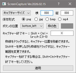 静止画のキャプチャー時、動画のキャプチャー終了時のショートカットを指定します。デフォルトは、「E」(Shift+Ctrl+E)です。他のアプリとバッティングする場合に、任意のキーに変更できます。